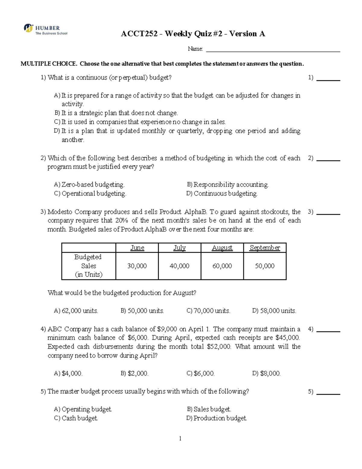 Weekly Quiz 2 Version A With Answer Key Acct252 Weekly Quiz 2 Version A Name Studocu